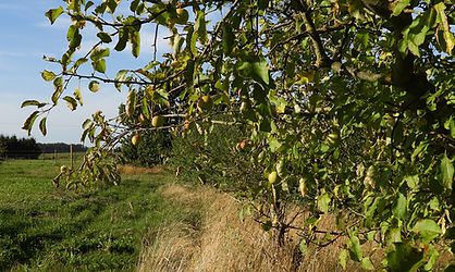 Du stehst am Rand einer Obstwiese mit dem Blick in die weite Landschaft. Wenn Dir danach ist, setzt Du Dich unter einen Obstbaum oder läufst einfach los in Richtung Wald.